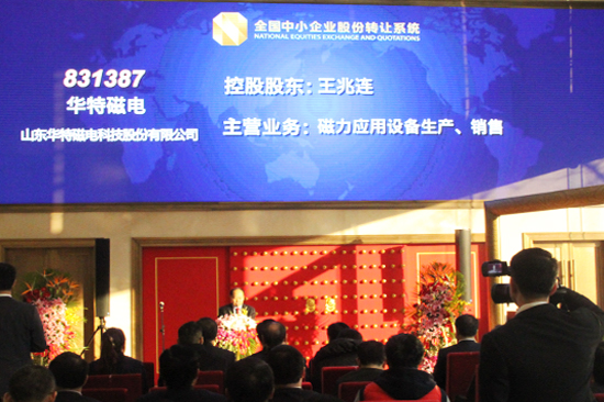 12月8日上午,山東華特磁電科技股份有限公司“新三板”掛牌儀式在全國中小企業(yè)股份轉讓有限責任公司隆重舉行。濰坊市金融工作辦公室副主任張新華、臨朐縣委常委、常務副縣長衣利民、臨朐縣金融工作辦公室主任高凌利、臨朐縣城關街道黨工委書記沈明新、臨朐縣東城街道黨工委書記孫傳坤、山東華特磁電科技股份有限公司董事長王兆連及公司股東和高管、臨朐縣相關企業(yè)負責人出席本次掛牌儀式。